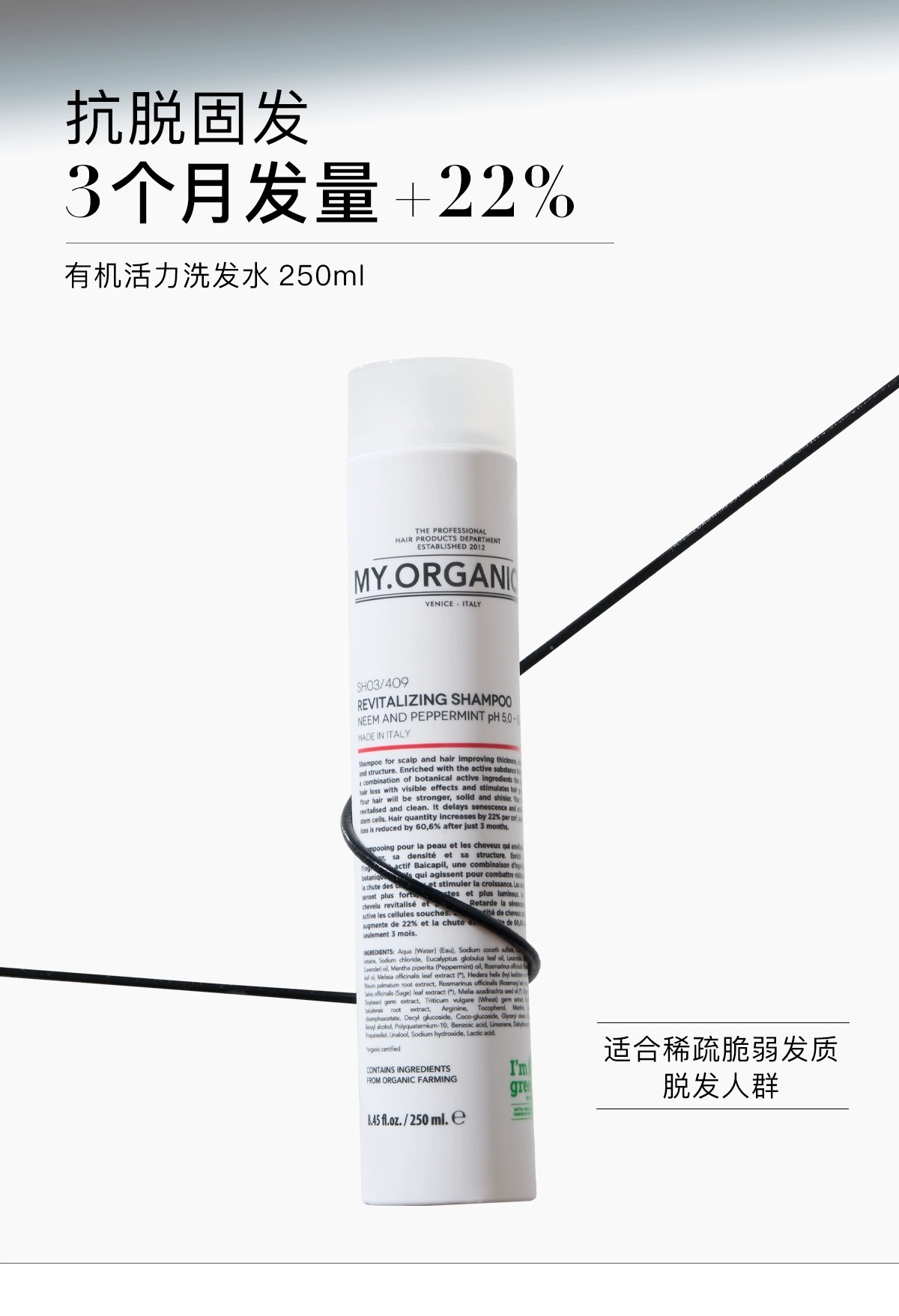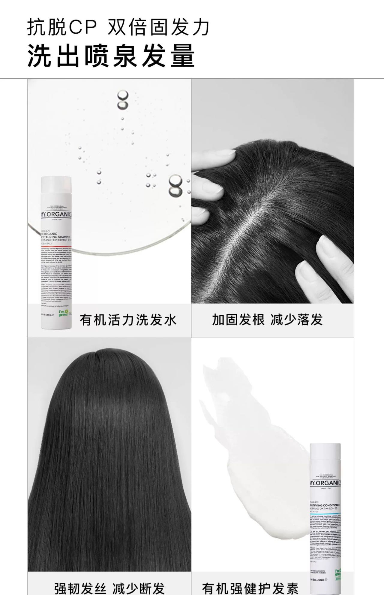 品牌:my.organics 品名:The organic revitalizing shampoo 功效:强韧防断发 发色亮泽 产地:意大利 包装种类:基础包装 适用发质:所有发质 规格类型:正常规格 是否为特殊用途化妆品:否 净含量:250ml