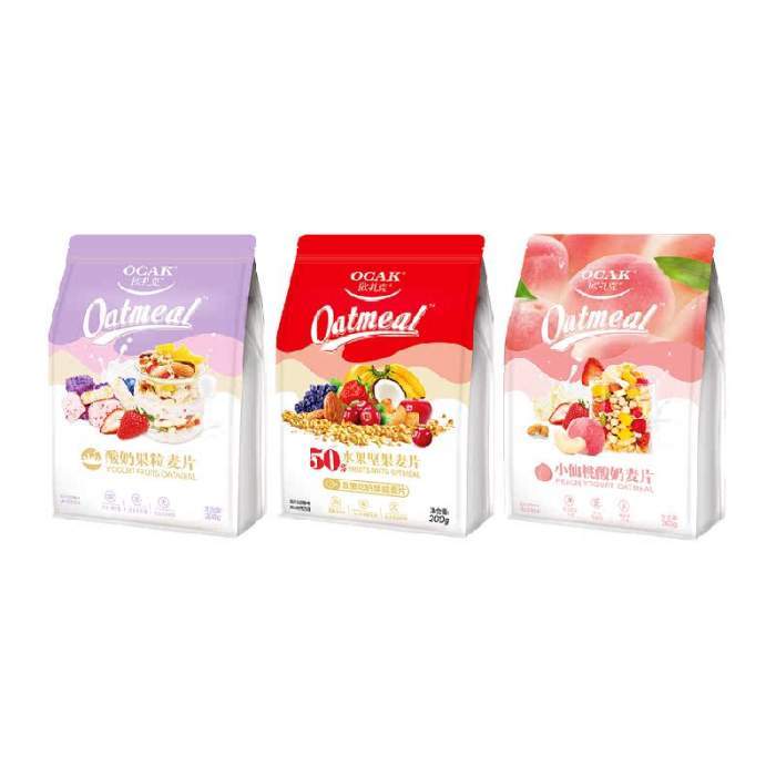 > 欧扎克水果麦片酸奶果粒燕麦片多口味任选营养早餐代餐零食三种口味可选,小仙桃酸奶麦片,巧克力味麦片,酸奶果粒麦片,水果坚果麦片,精选优质燕麦,搭配多种坚果,丰富搭配均衡营养,富含膳食纤维,增加饱腹感,促进肠胃蠕动,加入牛奶,酸奶,果香浓郁!
