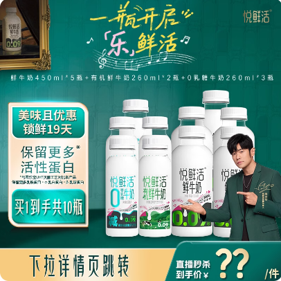 > 【直降】悦鲜活原味450ml*5+有机260ml*2+0乳糖牛奶260ml*3下拉57.6!悦鲜活旗舰店•鲜牛奶450ml*5+有机鲜牛奶260ml*2+0乳糖牛奶260ml*3,周杰伦带盐!原味/有机/0乳糖/都是当家鲜奶!!来自太行山生态牧场!够纯净够有机!才更鲜活!