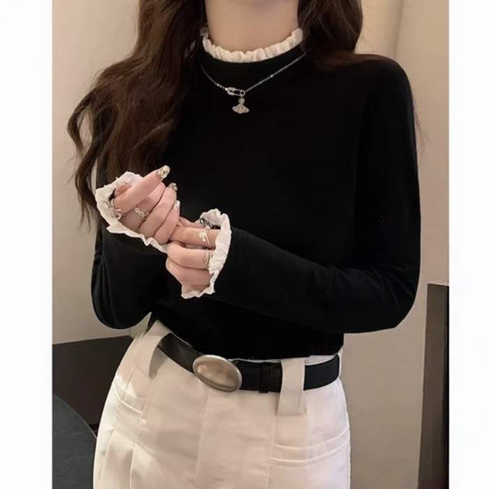 > 花边拼接半高领打底衫女秋冬双面磨毛修身设计感针织衫内搭ak花边拼接半高领打底衫女秋冬双面磨毛修身设计感针织衫内搭ak