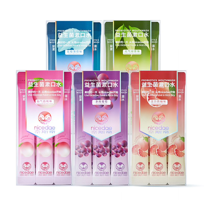> 【拍3盒】nicedae奈斯帝益生菌漱口水便携次抛抑菌清新口气(拍三件!再送12袋*2包,最终到手共84支!)多方位清洁随时口气清新,养成日常漱口的好习惯,净澈果香多种口味选择,多种口味多种心情释放。