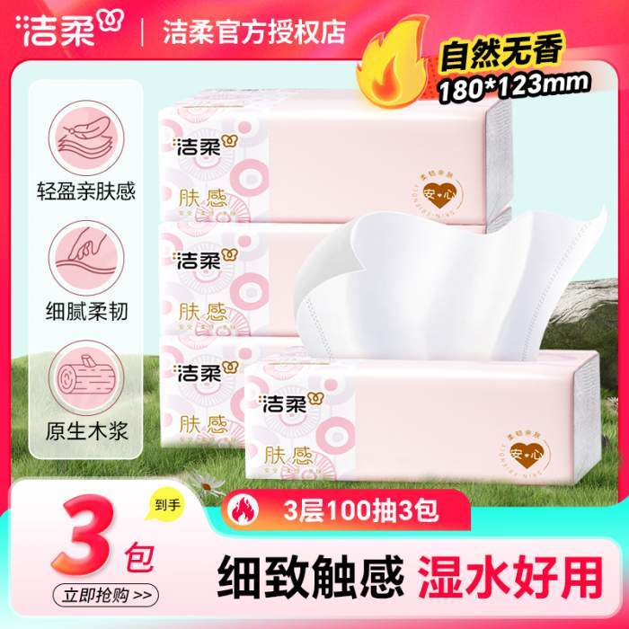洁柔抽纸纸巾100抽三层无香实惠装家用可湿水面巾纸餐巾纸卫生纸~!