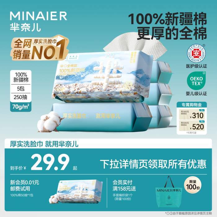 按45.9的价格结算!!!下拉详情页领券叠加金刚卷后到手25.3,芈奈儿新疆棉洗脸巾爆款好价。100%新疆棉!
