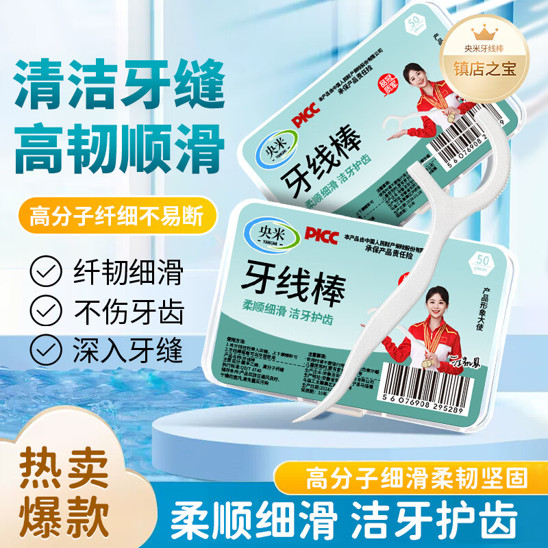 满39减27,到手价12.9元,央米牙线棒牙签线剔牙线深度清洁牙齿缝高拉力便携牙线圆线口腔护理 牙线50支-8盒