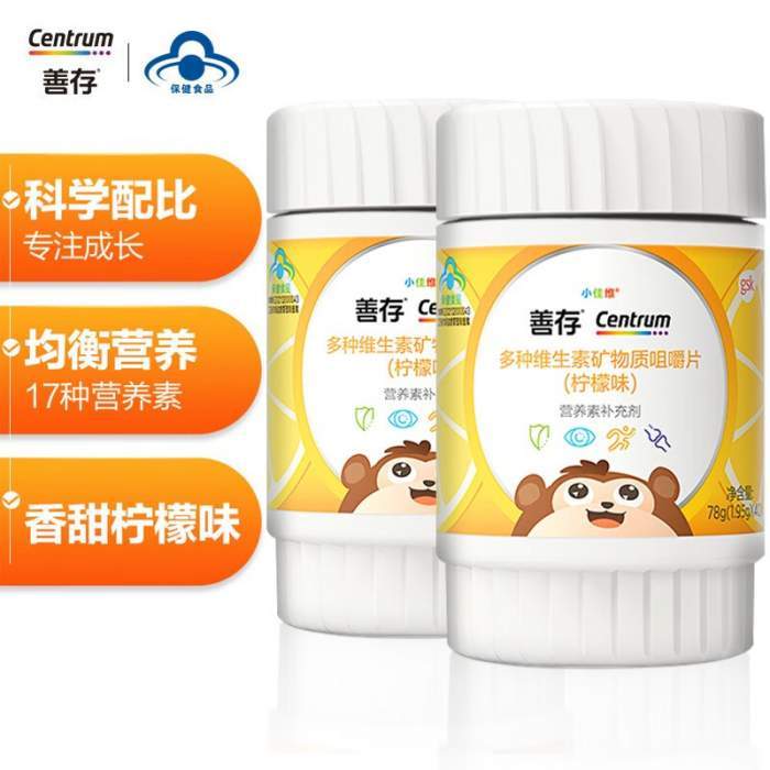 善存 儿童维生素 小孩补钙铁锌小佳维 多种维生素矿物质咀嚼片 柠檬味 【补充维生素ABCDE】 40粒*2盒 共80粒