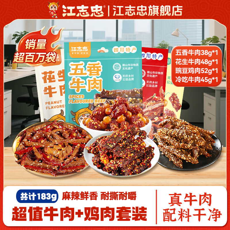 江志忠牛肉干香辣五香味蜀香冷吃牛肉袋四川特产地方风味牛肉183g套装 超值牛肉+鸡肉套装共计183g 牛肉干