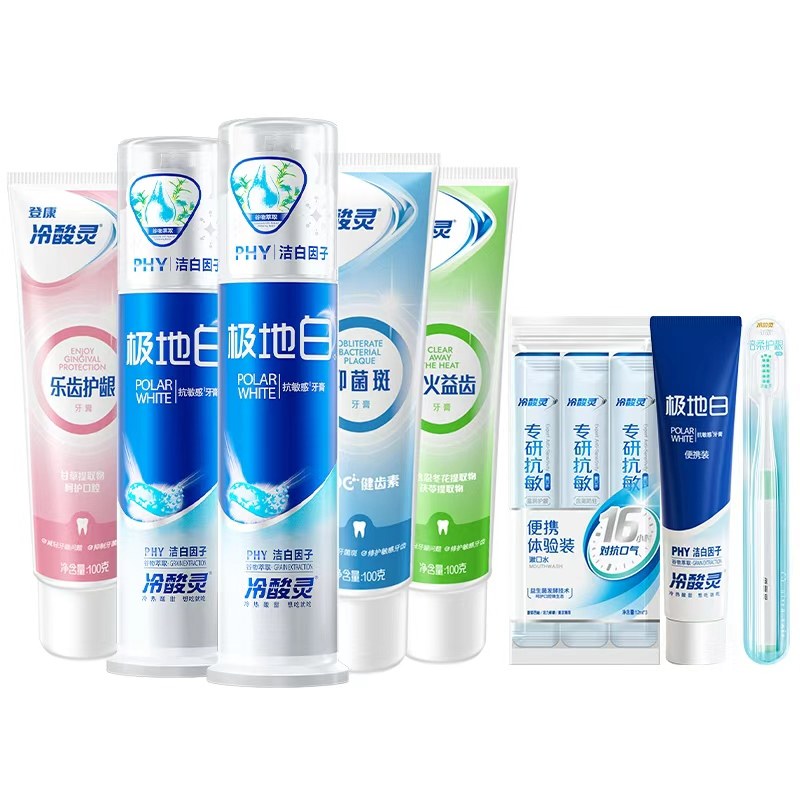 下拉!抵扣唫币+消费券22.4亓 年前最后一次活动了!过年家里人多用得快,快囤上!! 下单即赠漱口水12ml*3条+极地白牙膏30g+牙刷1支! 冷酸灵•极地白牙膏组合10件套 包含:极地白100g*2+乐齿护龈100g+抑牙菌100g+清火益齿100g 含赠到手10件!光泵式超市一支就麦38!咱有两只泵式的 直接回本!!