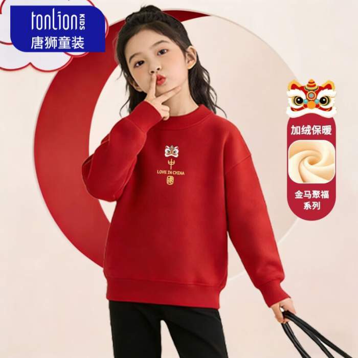 唐狮(TonLion)童装女童加绒卫衣2026马年本命年红色上衣儿童保暖喜庆拜年服 红色24中国KZB 160 高150-160重80-100